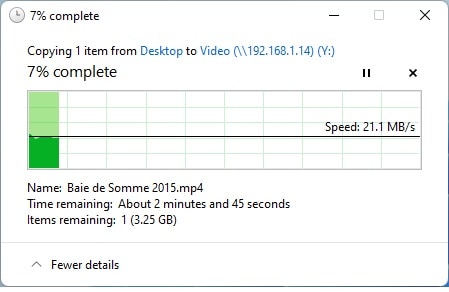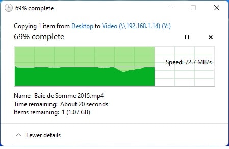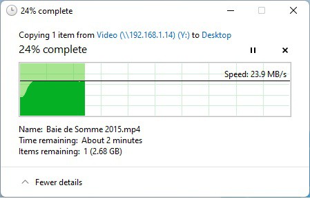 Nous nous sommes ensuite connectés en Wi-Fi à l’adaptateur devolo MAGIC 2 Wi-Fi 6 situés dans la même pièce. Les résultats sont un peu plus timides car le même fichier transférer n’atteint cette fois-ci que la vitesse de 23.9 Mo/s en téléchargement et 21.1 Mo/s en envoi.