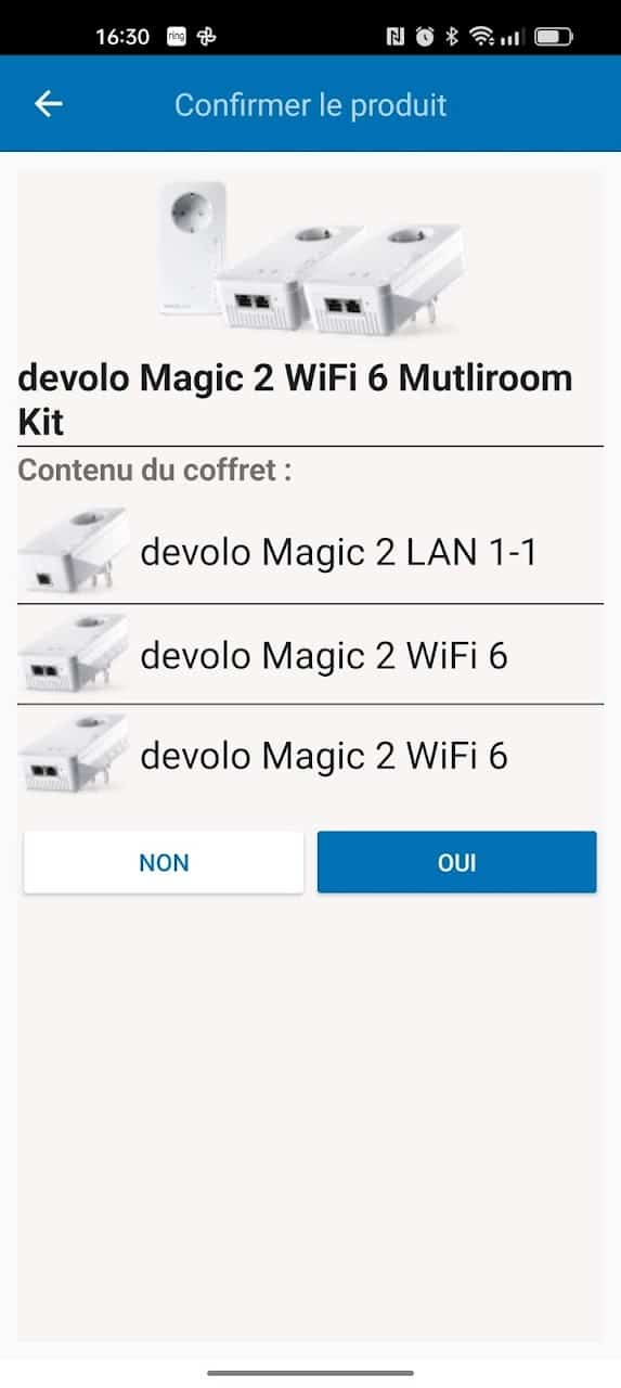 Vous choisissez le modèle de votre kit CPL sur l’application et elle vous demandera de scanner le code-barre présent sur la boîte de votre ensemble devolo. Vous devez ensuite installer les deux adaptateurs devolo MAGIC 2 Wi-Fi 6 sur des prises de courant libres.