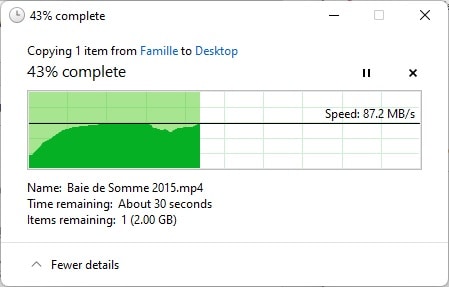 Pour effectuer nos tests, nous nous sommes placés à l’étage et nous avons mesuré tout d’abord notre connexion immédiatement depuis notre dispositif Wifi Mesh eePro 6 Pro d’Amazon à l’aide d’un fichier volumineux vers mon Nas Synology. Lee débitest pas mal du tout puisque j’arrive à une vitesse de 87.2Mo/s en téléchargement et 72.7Mo/s en envoi.