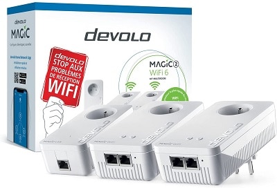 Si deux adaptateurs CPL vous suffisent, vous pouvez économiser en optant pour le « Kit de démarrage » devolo Magic 2 Wi-Fi 6 (réf. modèle 8817) qui comprend un devolo MAGIC 2 LAN (Box/routeur) et un devolo MAGIC 2 Wi-Fi 6.