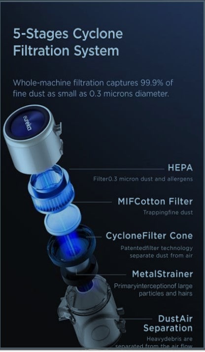 En plus, son système de filtration à 5 niveaux permet d’éliminer jusqu’à 99.9 % des micro particules aussi petites que 0.3 micro (un millième de millimètre)