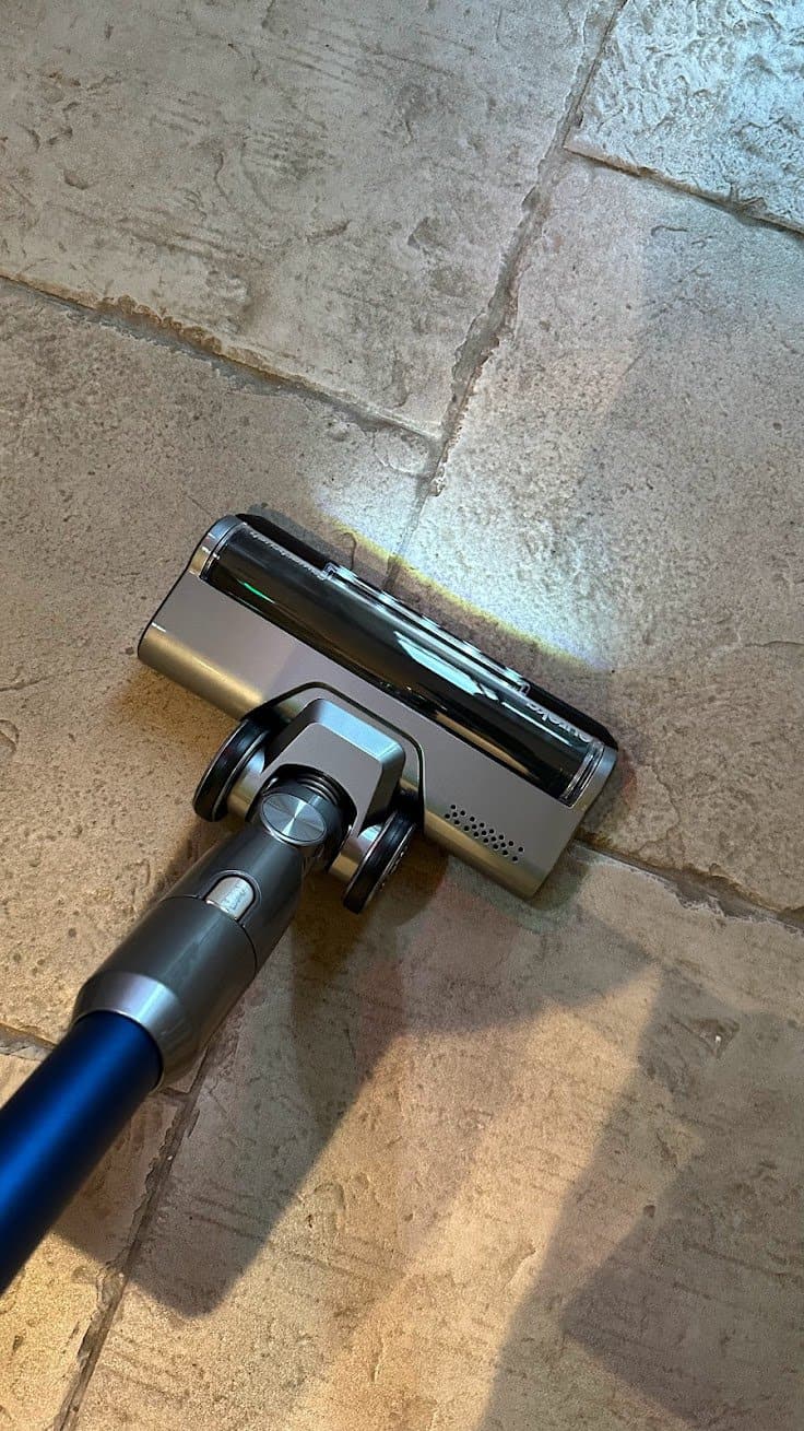 Les lumières LED sur la brosse principale permettent de voir les poussières invisibles. C’était la fonctionnalité innovante qu’on découvrait sur le Dyson V15 Detect vendu 800€ il y a 2 ans… C’est vraiment une sympathique fonctionnalité et c’est pratique à l’usage. Ici pour l’Eureka AK10, cela permet de bien regarder sous le fauteuil, sous les meubles ou dans les pièces moins éclairées, mais l’effet n’est pas aussi saisissant qu’avec la lumière verte d’une Dyson. Je ne sais pas si c’est une mauvaise chose car le Dyson V15 Detect me rendait fou : avec sa lumière verte on distingue EN PERMANENCE des poussières avec la désagréable impression que la pièce n’est jamais propre. Ici, c’est peut-être le bon compromis?