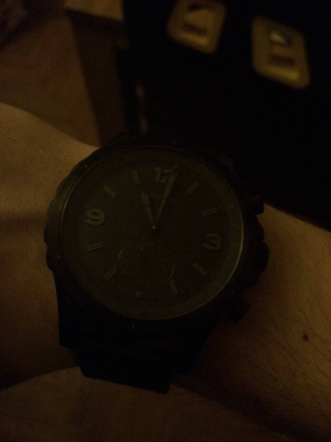 Jusqu’ici vous pourriez vous dire que c’est simplement que la montre ne me convient pas. Que toutes ces options rendent la montre plus sympa. Malheurement la Q-Nate cumule certains défauts qui décevront tout le monde. Sur la version que j’ai reçue en test la montre est noire et sans aucun rétro-éclairage, ni même de phosphorescence ! Ce qui fait qu’à moins d’être dehors en pleine lumière vous ne verrez quasi jamais où sont les aiguilles. Et je vous raconte pas comme vous allez devoir avoir le nez collé à la montre pour tenter de lire le petit cadran inférieur. Idem lorsque vous demander la date à la montre, qui tourne les aiguilles vers un tout tout petit numéro sur le bord du cadran vous indiquant le jour du mois. Au final vous devinez plus que vous ne lisez.