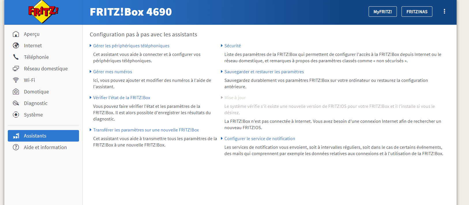 FRITZ!OS offre un accès complet à toutes les fonctionnalités du routeur, via une interface web très bien pensée, adaptée aux PC comme aux smartphones. La configuration se fait en quelques minutes, avec une reconnaissance automatique des périphériques, des assistants pas-à -pas et une aide en ligne très détaillée.