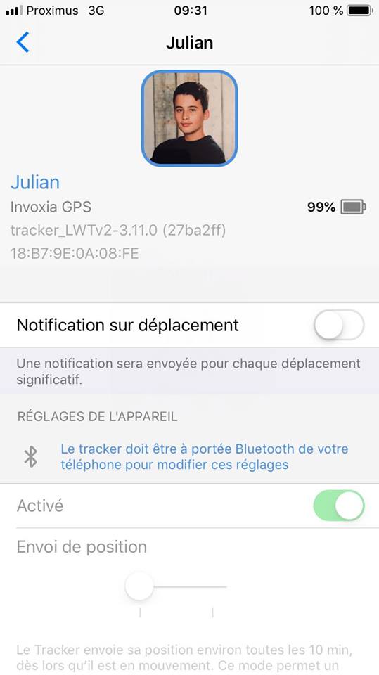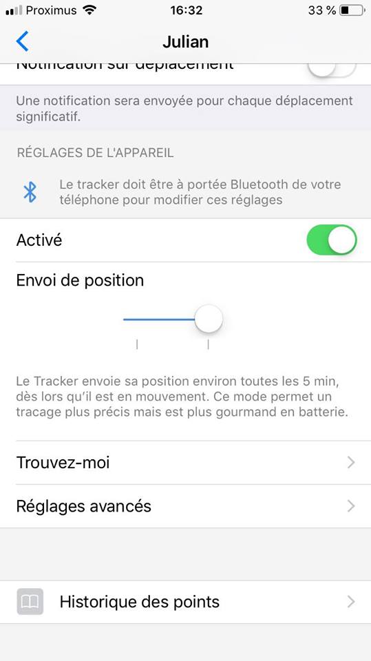 Plus besoin de s’écrire l’un, l’autre. Un coup d’oeil à l’appli aurait suffit pour savoir si il était proche d’arriver à la gare ou non. Seulement voilà, grosse déception. Il est impossible pour moi via l’appli de forcer une détection du GPS Tracker. Je dois attendre que celui-ci envoi un signal. Et même si sur papier il est sensé envoyer sa position toute les 10/15min, je vous promets qu’en pratique j’ai pu parfois attendre plus de 3/4h avant que je sache où se trouve mon fils.