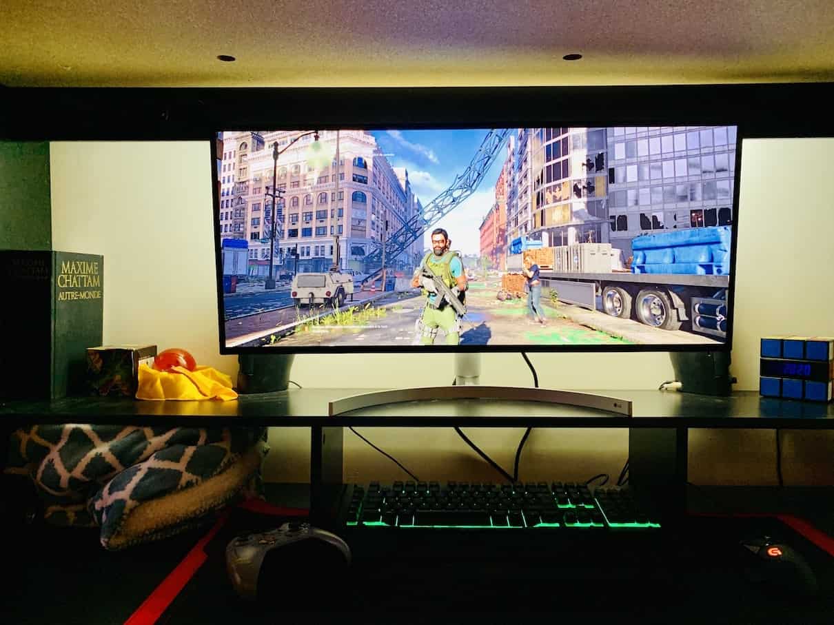 Pour les besoins du test j’ai joué à des jeux tels que Rocket League, The Division 2 ou encore Overwatch en résolution maximale (c’est à dire 5120×2160). Le résultat visuel n’est finalement pas tellement différent de la UHD et pourtant demande bien plus de ressources à votre machine. Et donc, là où j’arrive à jouer en 4K, ici mon PC est bien loin d’être capable de suivre la 5K.