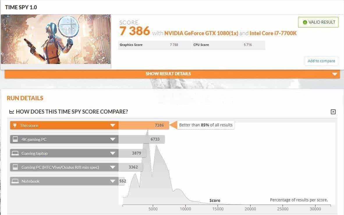 Bien sûr, la carte graphique seule ne vous suffira pas à obtenir un tel score. Dans la config testée, le CPU et la RAM étaient aussi de la partie. Et c’est grâce à tout cela qu’on a pu atteindre un score supérieur à 85% de la moyenne. Si vous désirez monter plus haut, il faudra vous diriger vers du SLI. Option tout à fait imaginable avec la 1080 au besoin.