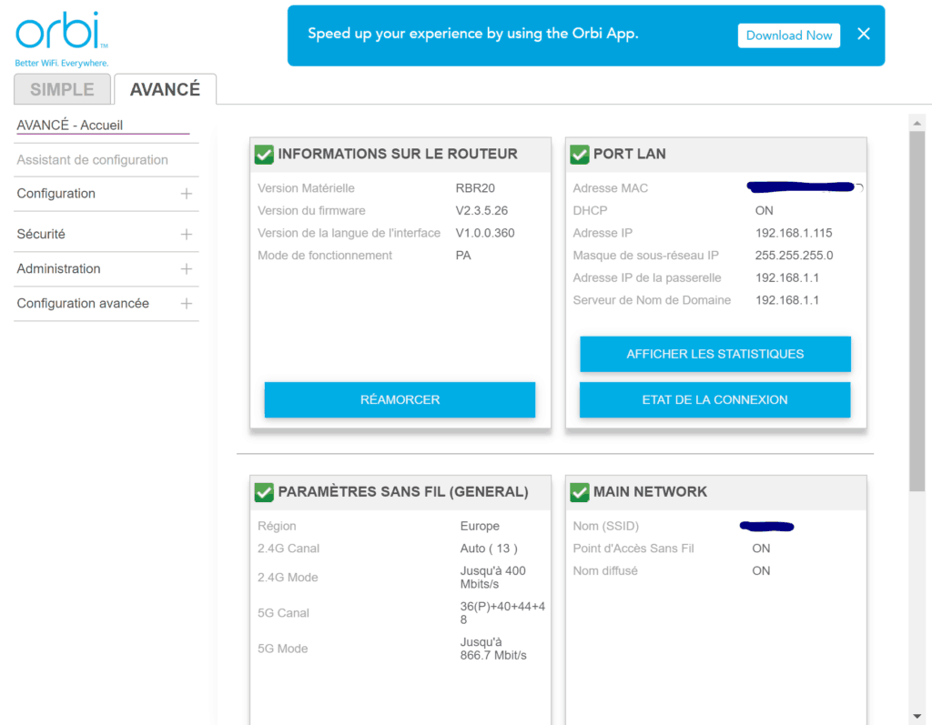 C’est via cette interface que vous pourrez, par exemple, choisir le mode d’utilisation d’Orbi : en tant que routeur ou point d’accès. C’est là aussi que vous pourrez gérer la redirection des ports, assigner un canal WiFi particulier, configurer un VPN ou configurer un DNS Dynamique.