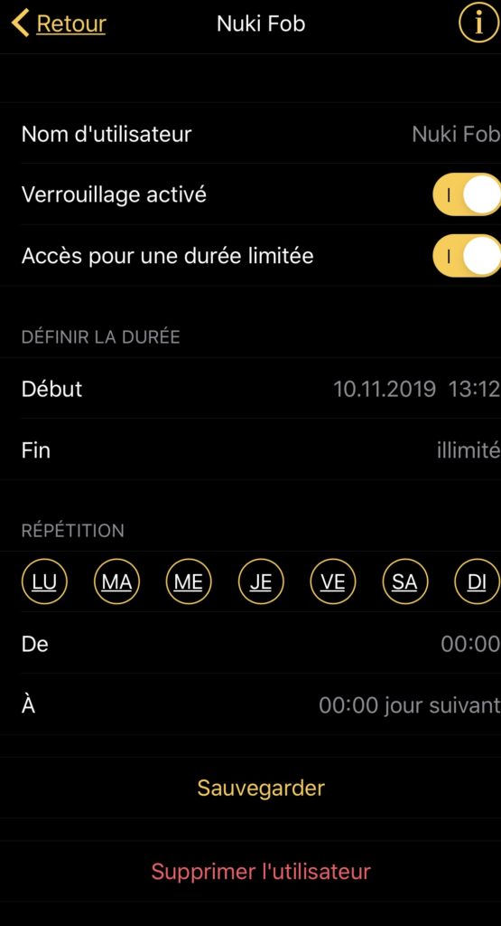 De la même manière que pour les codes d’accès, il est possible de définir une durée de validité et/ou des jours et heures d’utilisation.
