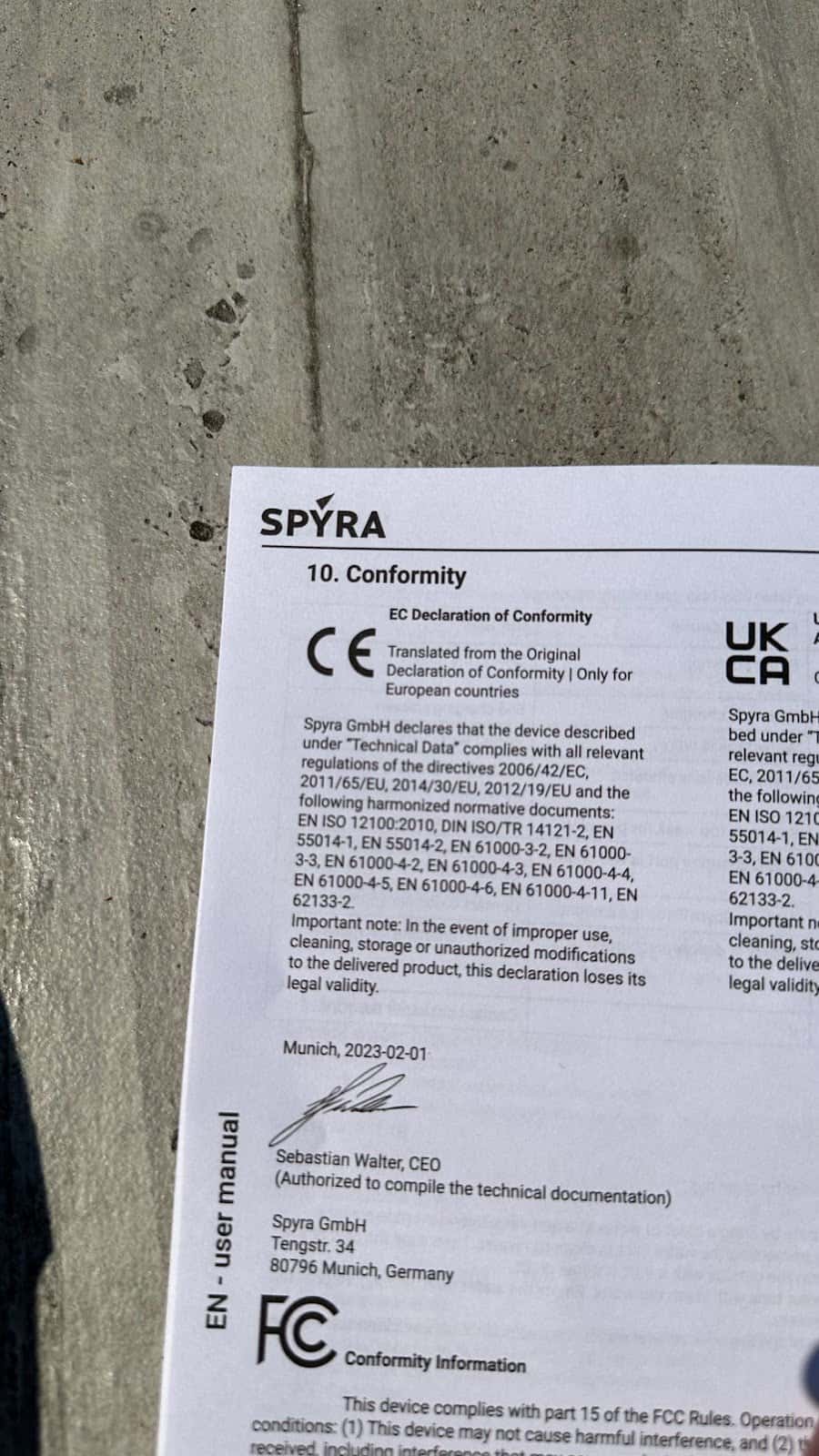 Effectivement, il y a des pistolets similaires sur AliExpress, à des prix bien inférieurs (parfois 20$…) et l’on pourrait croire que c’est un système de dropshipping qui abuse des personnes, mais il n’en est rien! En réalité, la firme Spyra est très sérieuse et est à l’origine de ce concept. Elle a d’ailleurs réalisé une opération de collecte de fonds sur Kickstarter, dans laquelle elle a levé 460 965€. Son fondateur et CEO Sebastian Walter existe vraiment et l’on retrouve dans le manuel du produit de nombreuses certifications CE signés par cette même personne (et c’est plutôt rassurant comme vous le verrez plus loin,) ainsi qu’un dépôt réalisé en leur nom auprès des propriétés intellectuelles européennes. Bon, comme vous pouvez le voir, j’ai joué les Sherlock Holmes en herbe, mais tous ces éléments m’ont convaincu que sur AliExpress, on trouvait surtout des contrefaçons. J’ai d’ailleurs eu la confirmation de la part de Spyra, suite à une demande d’information à ce sujet, qui m’a indiqué mener des actions contre ces faussaires.