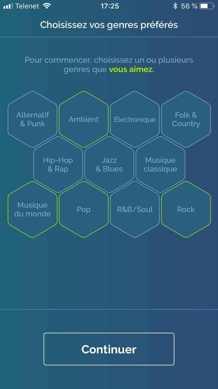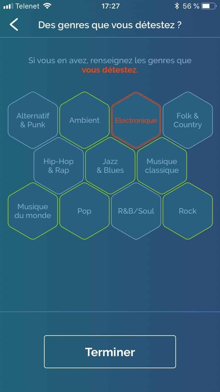 Afin de configurer votre Prizm, rien de bien sorcier. Après avoir installé leur app dédiée vous n’aurez qu’à tenter de donner une idée du genre de musique qui vous plaît le plus. Même si il faut avouer que les styles sont un peu trop complexes par moment et que j’ai trouvé le questionnaire d’entrée de Spotify plus simple avec son choix d’artistes.