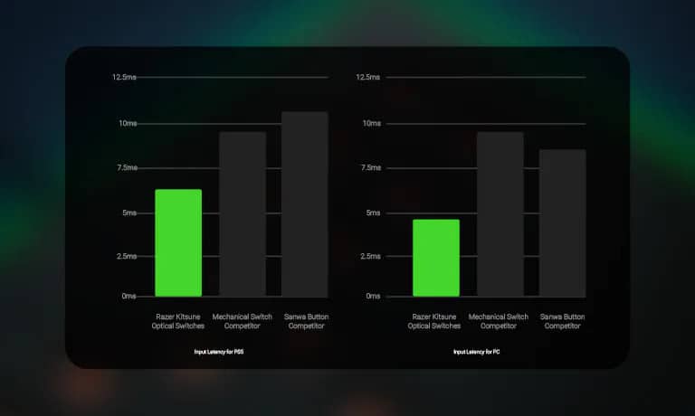 Fort de son expérience avec ses claviers gamers, Razer propose une petite révolution puisque les boutons intègrent des microswitches optiques, tels que ceux présents dans les claviers haut de gamme. Le but étant de proposer des temps de latences encore réduits par rapport aux systèmes classiques comme vous pouvez le voir sur le graphique ci-dessous :
