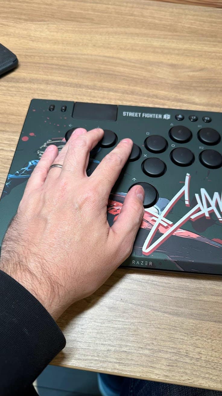 Une fois en main, le Razer Kitsune séduit : j’ai la version Cammy Edition et je trouve que l’impression est de très bonne qualité. La sensation avec les mains sur le contrôleur est bonne : on a suffisament de place et les doigts tombent toujours aussi bien sur cette disposition.