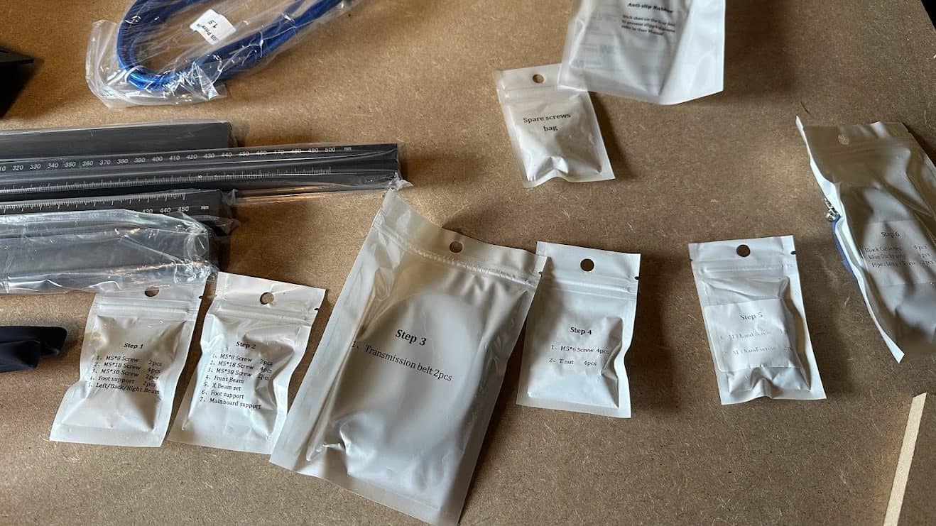 Après avoir passé commande pour la Sculpfun S30 Pro Max, on reçoit l’ensemble qui tient dans une toute petite boite. Les pièces sont bien protégées et surtout classées : il y a un sachet de vis pour chaque étape de l’installation et chaque élément est nommé pour que vous puissiez facilement le retrouver : IKEA devrait en prendre de la graine.