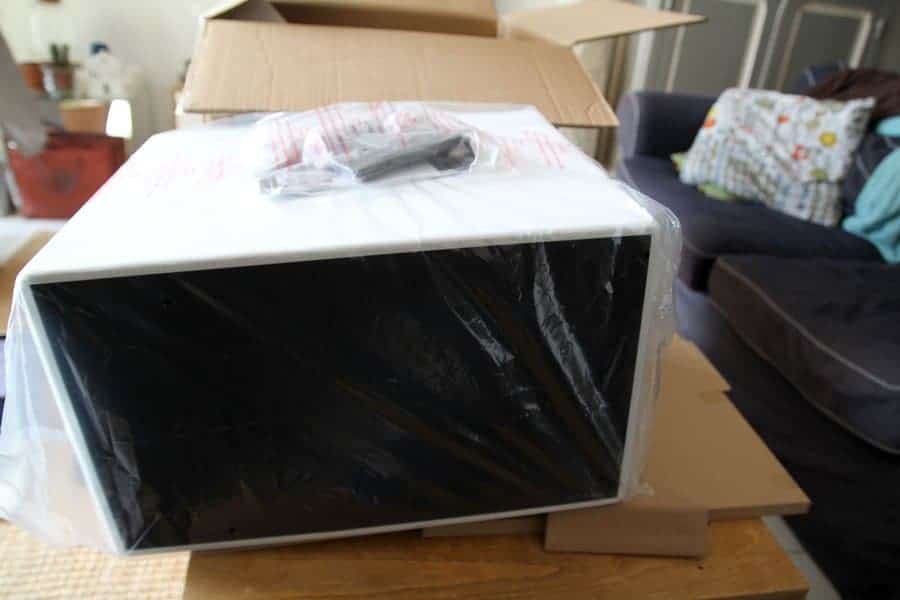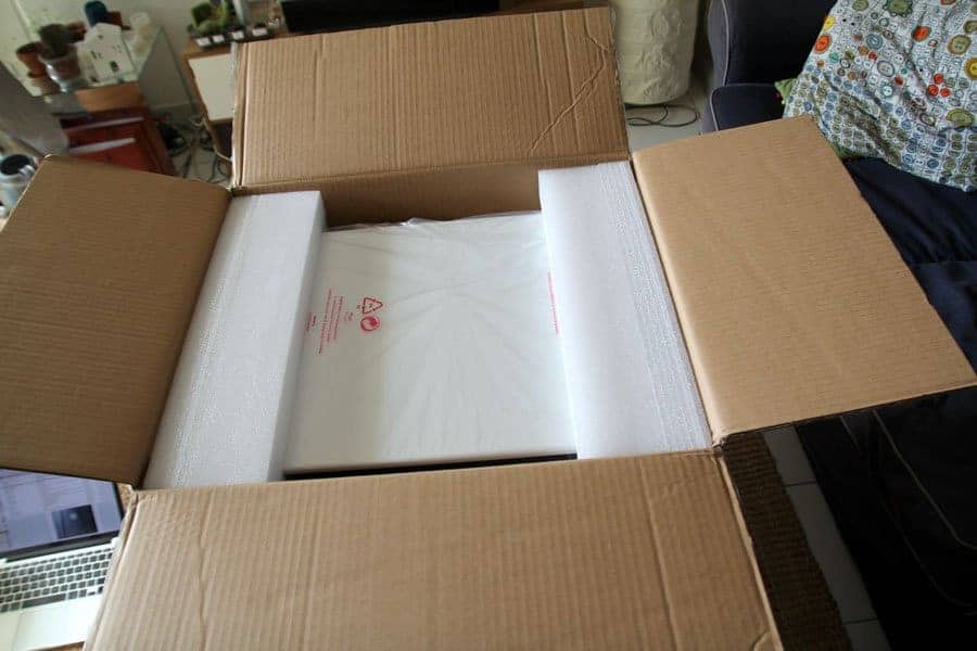 Premier indice d’un prix serré : le packaging de la Soundtower XL n’a rien de sexy. Un vieux carton imprimé, des housses en polystyrène, une boîte à part pour le pied…