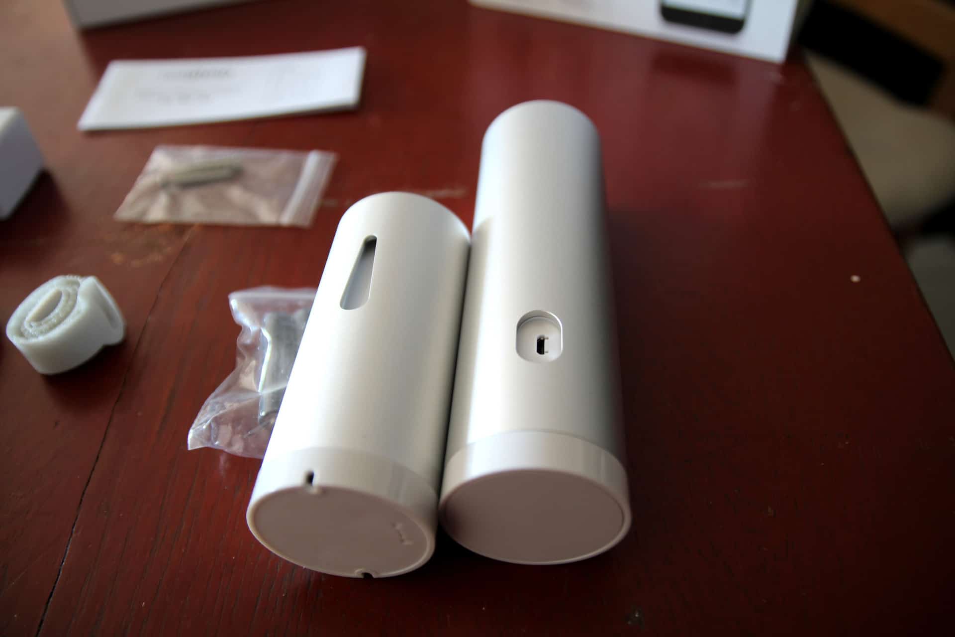 Le petit tube est le capteur extérieur. Alimenté par deux piles (fournies), il est passif : on ne peut interagir que via le master. Il est fourni avec plusieurs systèmes pour le fixer au mur, ou le lester. Le message est clair : le truc ne doit pas tomber. Il doit être très fragile…
