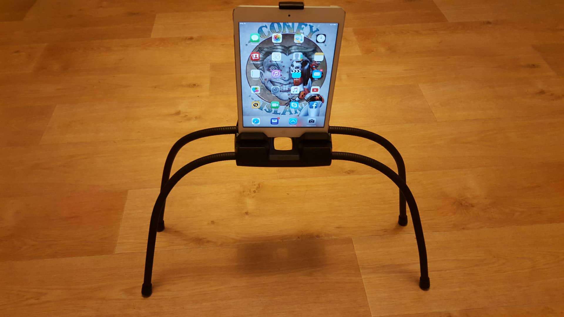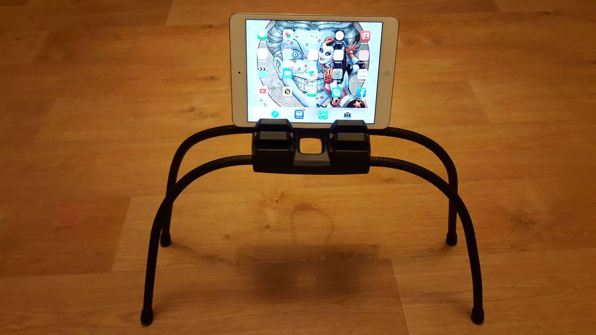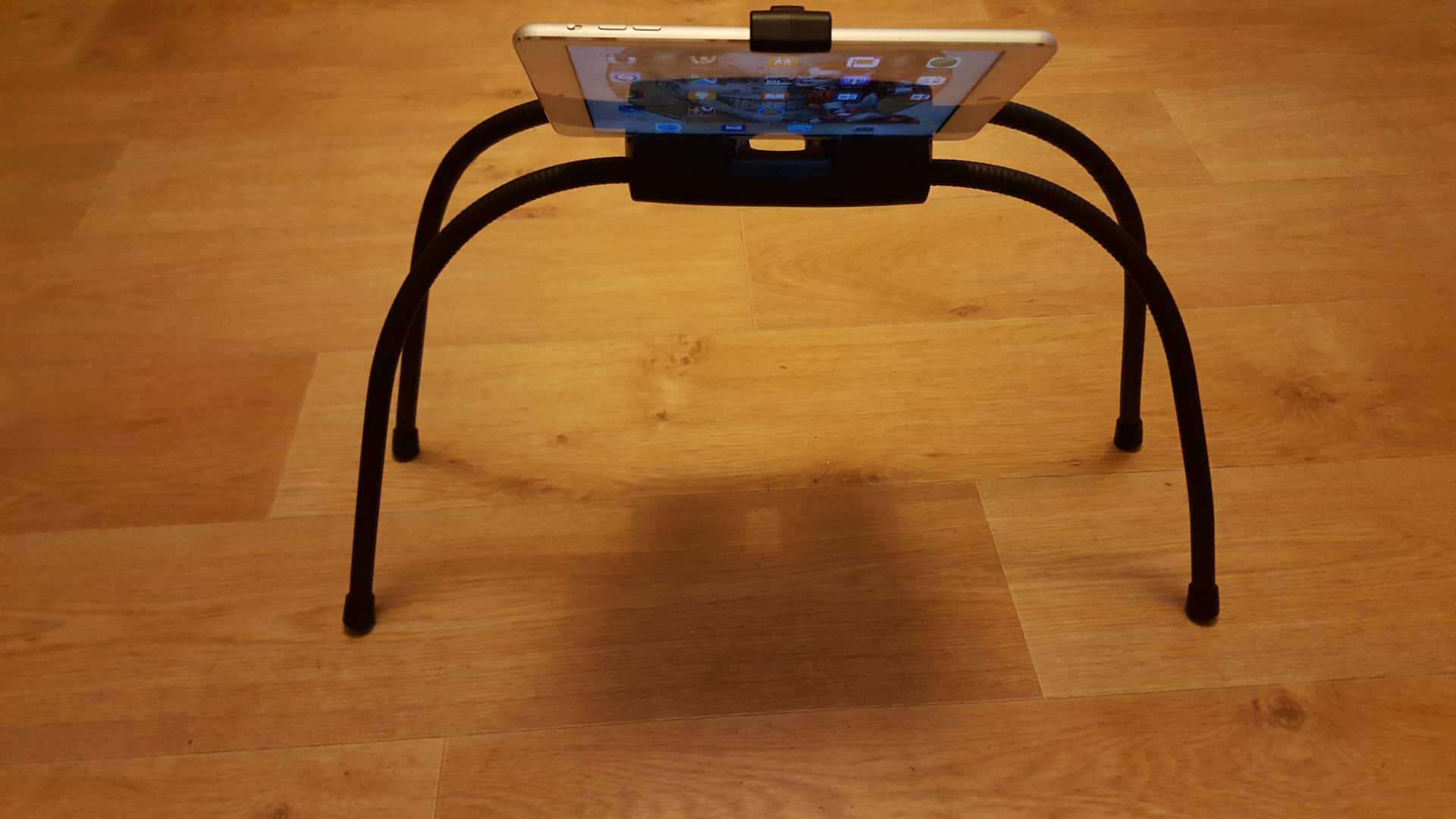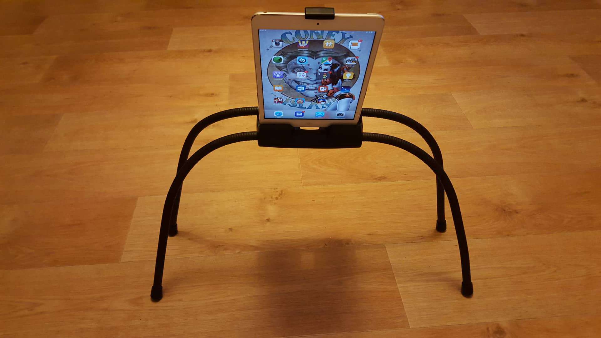 De couleur noire, passe-partout, cet appareil me fait penser à une araignée avec ses longues « pattes » qui mesurent 35 cm. Les rainures dans lesquelles on pose sa tablette ont une largeur de 10 mm. La prise en main est assez simple, car sur le carton d’emballage, il y a différents schémas écrits en anglais qui expliquent et montrent comment déplier et installer Tablift. Surtout, n’ayez crainte : même si c’est en anglais, si vous avez un minimum de connaissances et de logique ça devrait aller tout seul pour tout comprendre. Une fois l’objet en main, je le trouve un peu lourd, mais pour une utilisation à la maison, c’est parfait. Robuste, sa stabilité fait face à toutes les épreuves, même après l’avoir bousculé doucement il s’est remis immédiatement en place.
