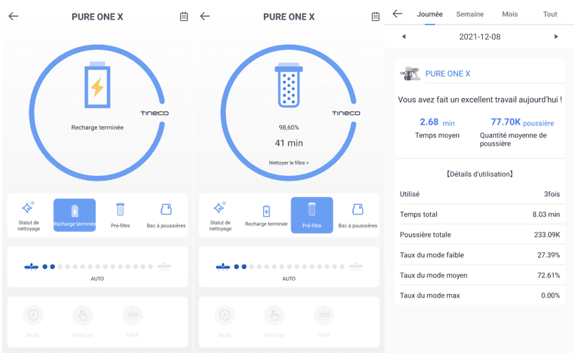 En téléchargeant sur votre smartphone, l’application Tineco, vous aurez à votre disposition une série d’informations, certes un peu gadget, sur l’état de la batterie, et donc de l’autonomie restante, du nombre de poussières aspirées ou encore du temps d’utilisation journalier.