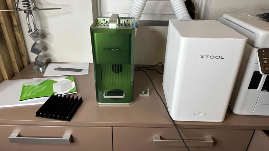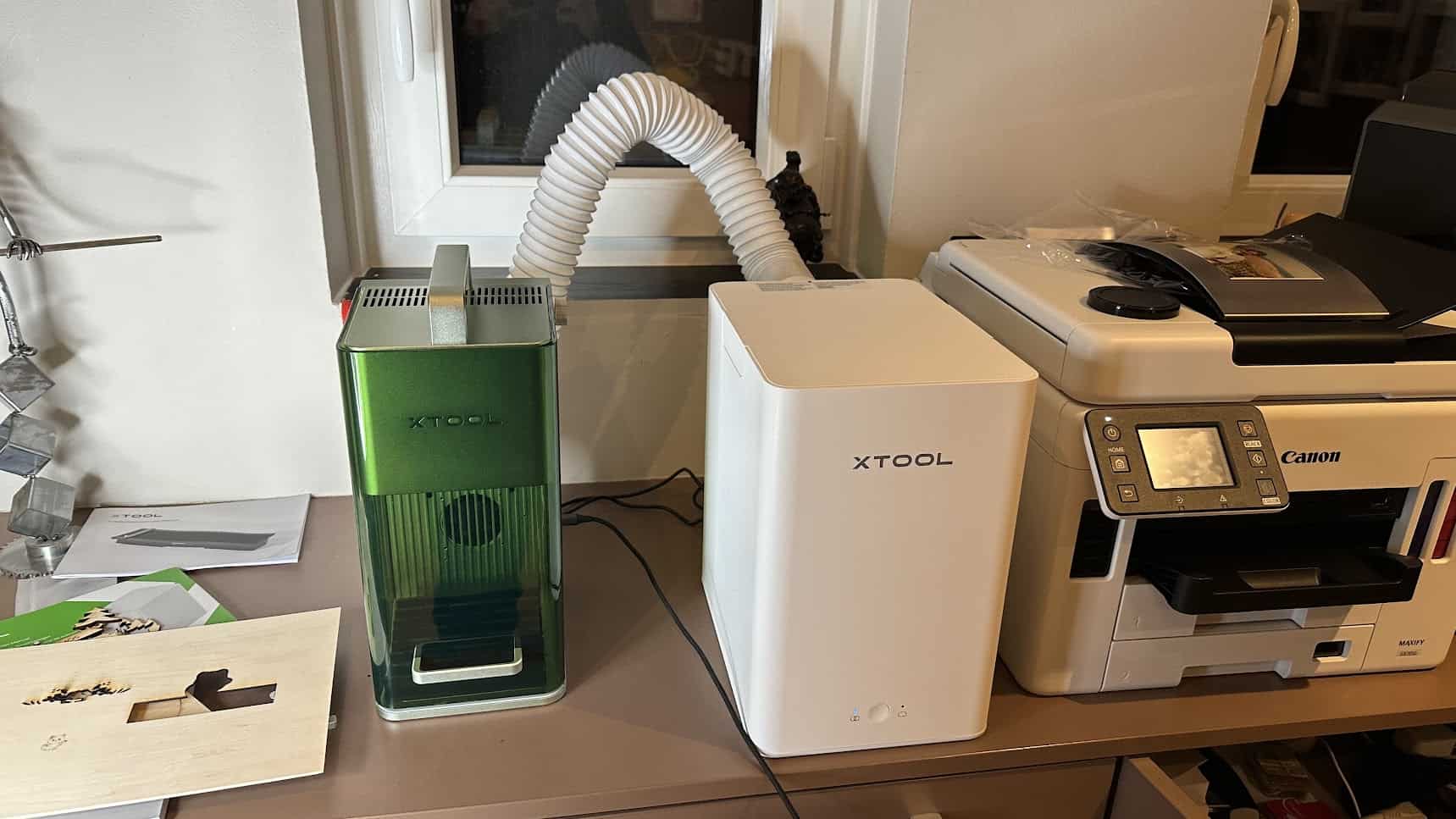 Si vous comptez utiliser la xTool F1 en intérieur : vous aurez besoin de ce module ! Autrement, vous pouvez aussi raccorder le tuyau d’évacuation vers une fenêtre directement.