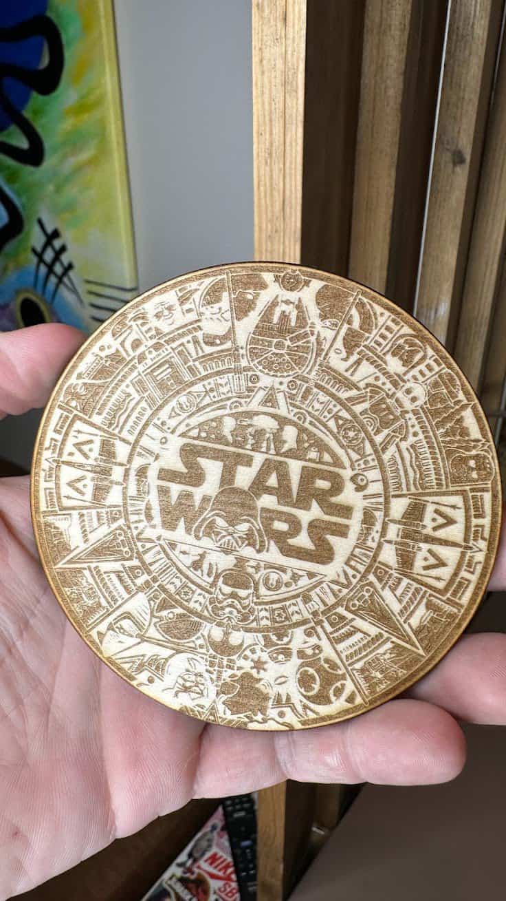 Pour tester cette nouvelle machine du labo, j’ai été accompagné de ma fille : Sofia, qui regorge d’idée et de demandes pour réaliser un tas de choses. Ce que je peux déjà vous dire, c’est que l’ensemble s’utilise de manière enfantine ! On a réalisé des gravures sur bois, pierre, métal en suivant les recommandations du site sans rencontrer vraiment de difficulté. Le plus choquant reste la vitesse d’exécution, de quelques secondes à quelques minutes pour la gravure Star Wars super complexes. Moi qui trouvais déjà la gravure bien plus séduisante que l’impression 3D en raison des temps restreints, ici c’est encore 10 fois plus rapide !