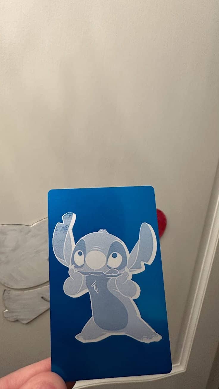 Comme j’avais une carte métallique bleu et que Sofia adore Stich, j’ai essayé de faire une gravure de ce personnage en métal : je trouve le résultant et le dégradé de couleurs assez impressionnant.