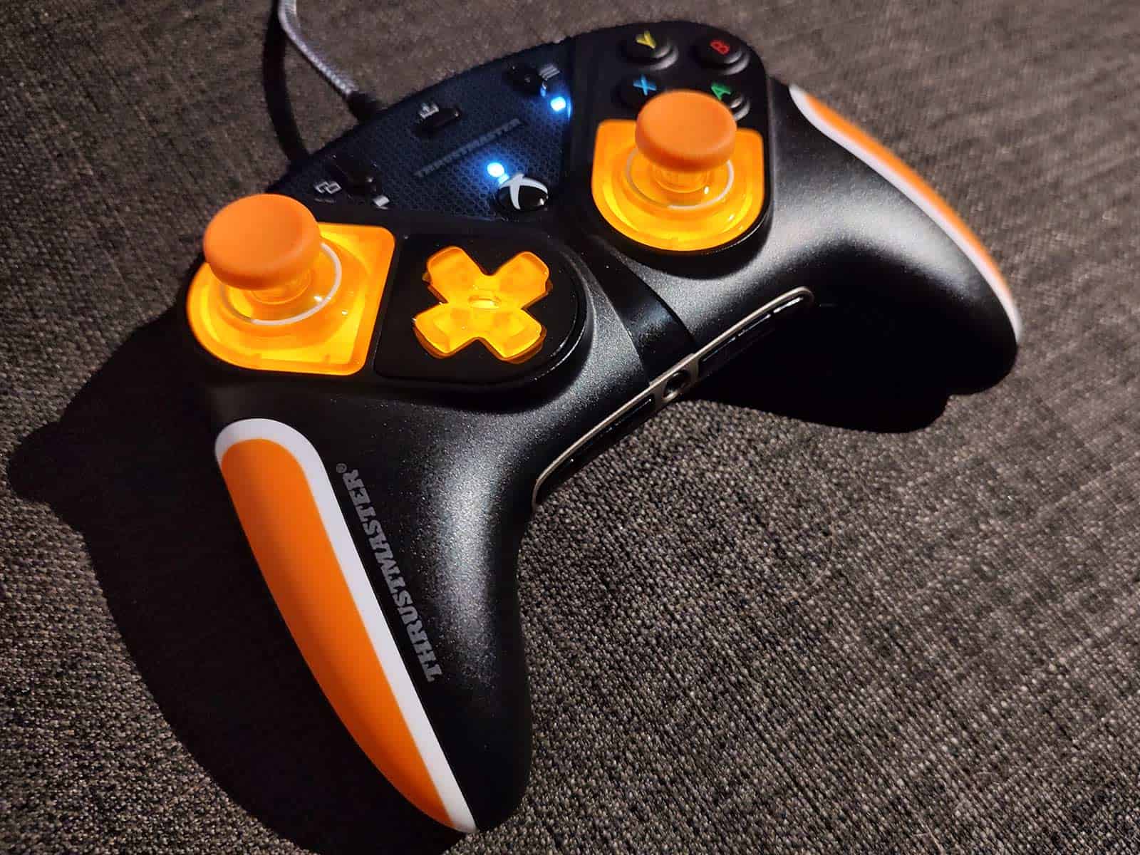 Signalons tout d’abord que ce pack est purement cosmétique et qu’il existe en plusieurs coloris. Celui-ci permet d’illuminer la Thrustmaster eSwap X Pro puisqu’il propose des modules RGB orange. Le pack contient également des grips et des gâchettes transparentes additionnelles. Si j’avais quand même un petit reproche à faire à tout ça, c’est que la lumière des modules ne passe pas au travers des gâchettes qui sont transparentes, mais honnêtement, c’est un détail. Je suis d’ailleurs persuadé que le tout plaira aux inconditionnels du RGB.