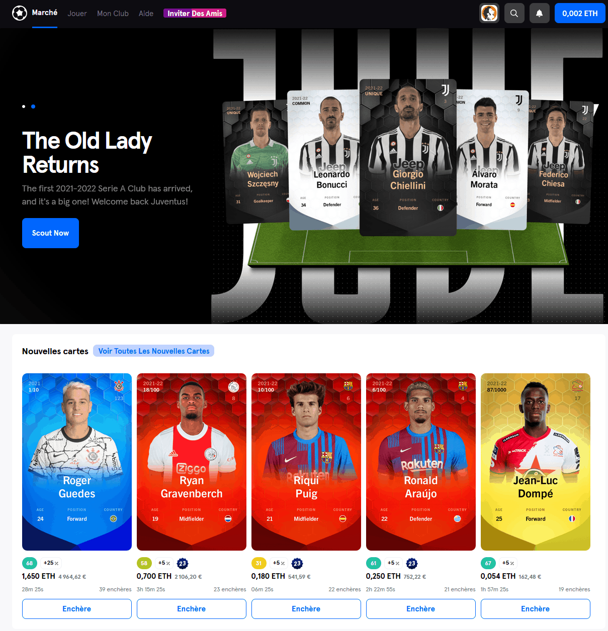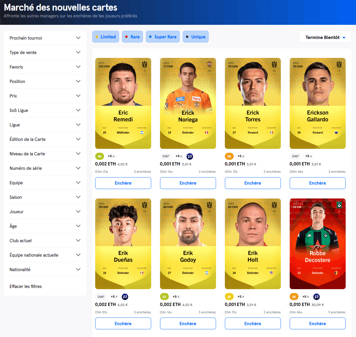 - Soit aller sur le marché dit primaire où vous pouvez acheter les nouvelles cartes. Il s’agit d’un principe d’enchères, la carte ira donc au plus offrant. Elles sont vendues exclusivement par Sorare.