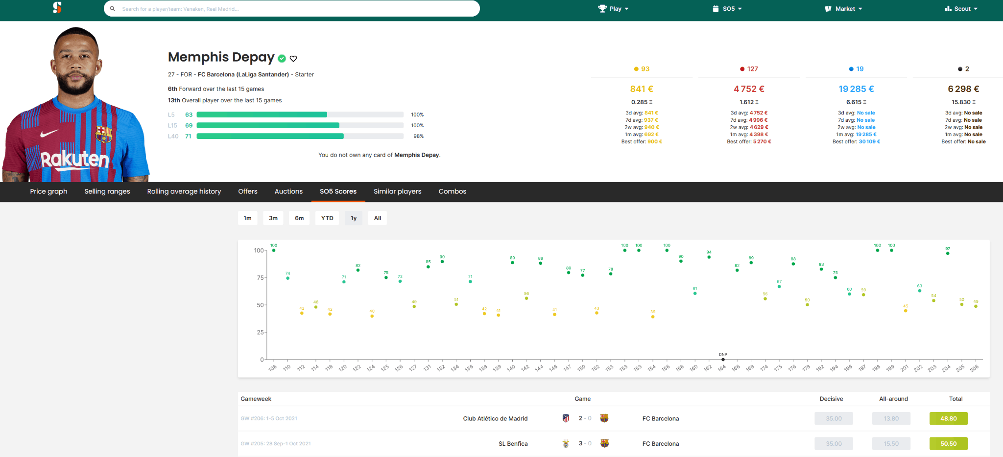 L’outil idéal pour le scoring est SorareData qui offre des fonctionnalités multiples telles que le classement des joueurs par championnat et ligue, le prix de vente sur le mois ou encore la note moyenne du joueur au cours des 15 derniers matchs. Cet outil vous aide donc à suivre vos résultats et à améliorer vos équipes. Vous pouvez vous y connecter directement depuis votre compte sorare.