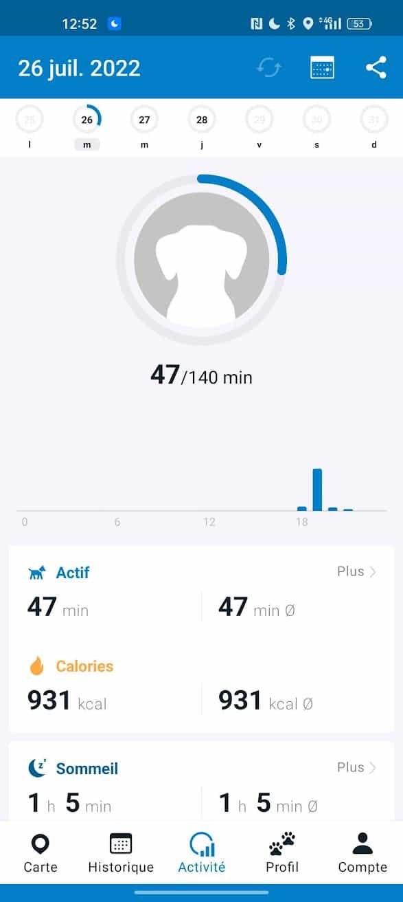 - Suivi d’activité et moniteur de sommeil : Il est possible de suivre le niveau d’activité de son chien et ses habitudes de sommeil.