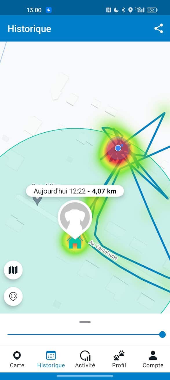 Il s’agit du mode par défaut de l’application sur smartphone. Ici, la position de votre animal de compagnie est mise à jour automatiquement. Toutefois, contrairement au livre tracking, le rapport de position est fait à intervalles de temps irréguliers. Dans la pratique, sa position sera reportée s’il bouge beaucoup.