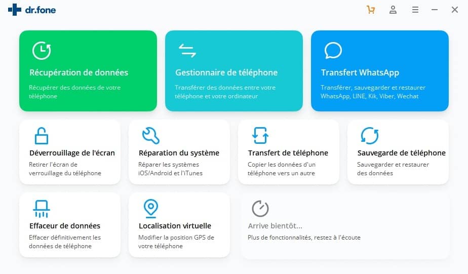 Wondershare Dr.Fone vous offre de nombreuses fonctionnalités pour la gestion de vos appareils mobiles et de vos données, et bien plus encore. Voyons ensemble ce qu’il propose :