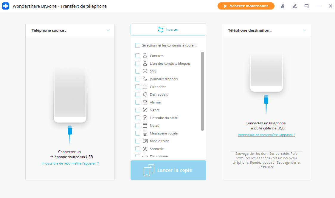 - Étape 2. Sélectionnez l’outil Transfert de téléphone dans le menu principal de Dr.Fone, une nouvelle fenêtre s’ouvre. Une fois les deux appareils reconnus, vous pouvez sélectionner l’appareil source et l’appareil de destination.