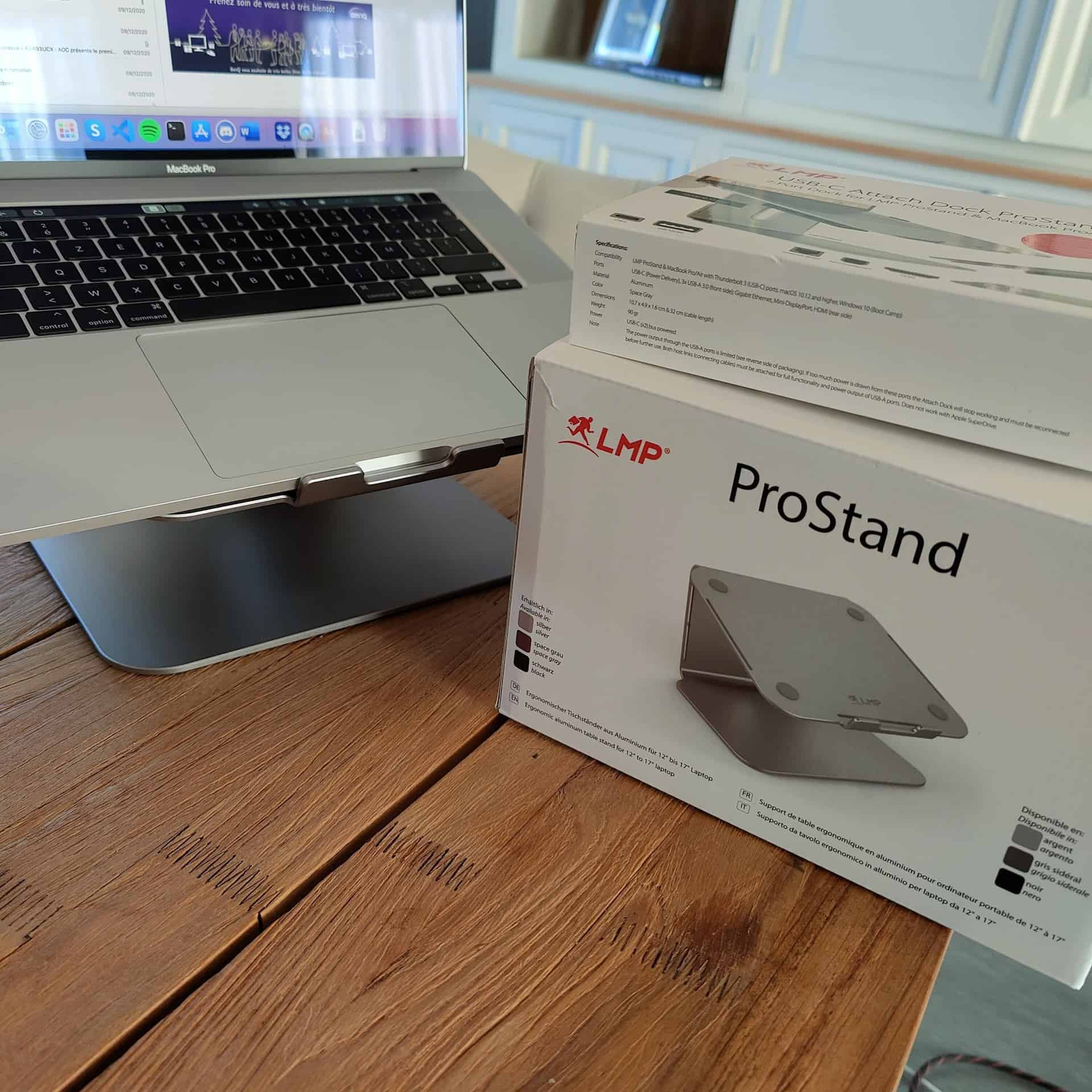 J’ai opté pour ma part pour la station d’accueil LMP ProStand qui aide à disposer le MacBook en hauteur afin d’épargner votre dos et d’aligner sur votre second moniteur.
