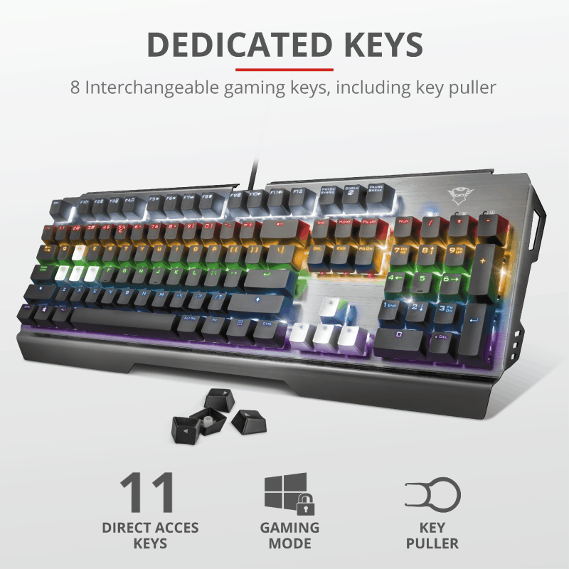 Lorsque j’ai vu le Trust GXT 877 Scarr en ligne, je n’avais pas de suite remarqué que son cadre était métallisé. Et dès le déballage, cela m’a vraiment plu car cela renvoie un sentiment de qualité et de classe que n’ont pas les claviers en plastique. Idem pour la sensation de retour sur les touches mécaniques.