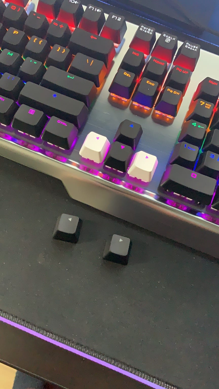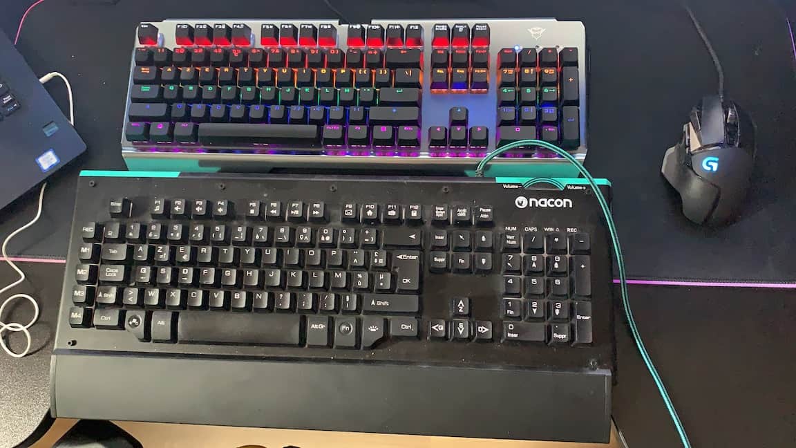 La plupart des claviers gaming tournent aux alentour de la centaine d’euros (même si certains peuvent passer la barre des 200 euros comme l’Apex Pro TKL testé récemment par Johnny) Ce qui différencie les claviers en dehors de leurs détails techniques ce sont les éventuelles options et design. Mon ancien clavier avait pour lui 4 touches macro configurables. Le Trust GXT 877 Scarr de son côté va clairement tenter de vous séduire avec son mode arc-en-ciel. Sans oublier les 8 touches blanches que vous pourrez disposer en lieu et place des flêches et des ZQSD.