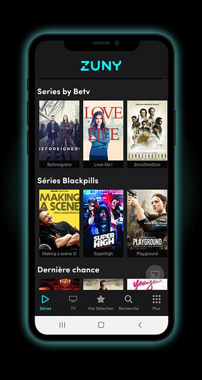 Zuny c’est simple, clair et précis : 2 offres, une avec et une sans mobile, toutes les deux avec des séries exclusives et internet illimité, 1 application installable sur 5 appareils et les séries sur 2 écrans en même temps.