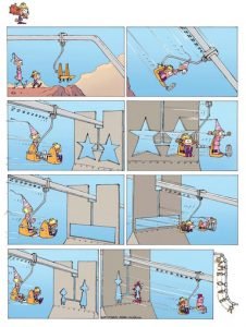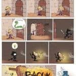 Game Over T17, comme les précédents albums, est un enchainement de gags plus qu’une histoire et franchement, j’adore. On se délecte de cet humour complètement absurde et on constate que l’humour muet peut être tout aussi efficace que les autres s’il est bien mis en scène. Les gags sont comme toujours super drôles et la bêtise de la princesse n’a d’égal que son amour pour le petit barbare. Celui-ci rivalisant d’ingéniosité afin d’essayer d’arriver à la fin du stage, n’y arrivant jamais vu que quelque chose vient toujours se mettre en travers de son chemin, le plus souvent sa propre dulcinée d’ailleurs.