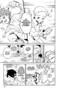 Sans compter que ce n’est jamais simple de mettre en image un manga dans lequel il n’y a, à priori, pas ou peu de scènes d’action. Car même sans vous dévoiler quoi que ce soit je peux tout de même vous dire que (jusqu’au tome 2 où j’en suis en tous cas) les scènes dynamiques sont assez rares. La difficulté devient alors pour The Promised Neverland, comme pour beaucoup d’autres d’ailleurs, de nous offrir des scènes qui soient intéressantes visuellement au moins d’un point de vue mise en scène. Et de ce point de vue là, c’est gagné ! Et puis si en plus on nous met encore des réactions “pur manga”, moi je suis preneur.