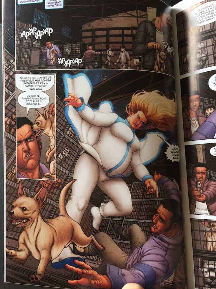 Côté artistique, Francis Portela, Marguerite Sauvage et Andrew Dalhouse sauvent les meubles en nous offrant de superbes planches. Tantôt pop art dans les songes de Faith, ensuite réaliste lors des combats intenses fort bien mis en scène. J’adore ! Reste à voir si on ne leur a pas trop demandé de mettre en avant les formes généreuses de Zéphyr. Qu’on se comprenne bien, je n’ai aucun souci avec les formes de Faith elle n’en reste pas moins superbe, mais ce serait dommage qu’elle ne se résume qu’à cela.