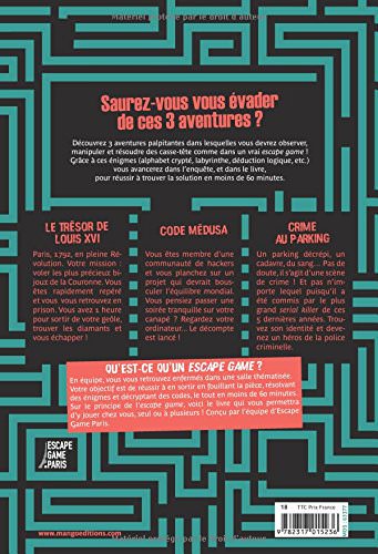 Dans cette version papier, le jeu est présenté simplement mais clairement avec une petite introduction sur le concept du escape game, l’explication de son fonctionnement et le résumé des 3 énigmes à résoudre. Tout d’abord, vous plongerez à l’époque de Louis XVI et votre mission sera de vous échapper de prison et de retrouver les joyaux de la couronne que l’on vous a demandé de voler. Ensuite, tentez de trouver le hacker qui menace les membres de votre réseau en utilisant certaines technologies à votre disposition. Enfin, devenez le plus fin limier afin de résoudre un crime dans un parking pour impressionner vos collègues et prendre du galon. Plus une seconde à perdre, le crime n’attend pas.