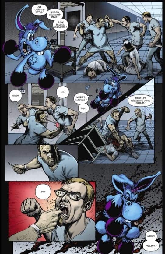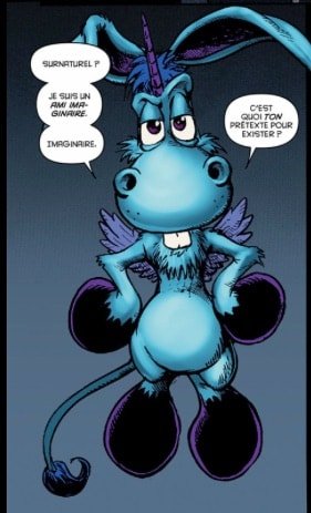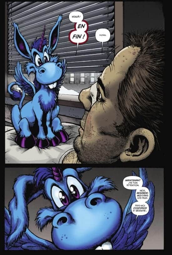 À beaucoup d’égards Nick m’a fait penser à Heath Huston du comics Fear Agent. Et si vous avez lu mon article sur celui-ci vous comprendrez à quel point c’est un compliment venant de ma part. Mais la grande différence entre Heath et Nick c’est un tout petit ami imaginaire bleu. Non pas un schtroumpf mais bien Happy, une licorne ailée sortie tout droit de l’imaginaire d’une enfant kidnappée par un Père Noël qui ne donne pas forcément envie d’aller sur ses genoux.