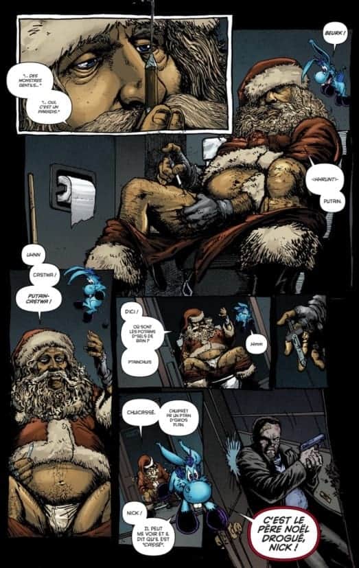 Découvrir ce comics en cette fin d’année tombait vraiment bien. Pour la simple et bonne raison que le tout se passe à la période de Noël. Sorti originellement en Septembre 2013, il était déjà alors publié au meilleur moment possible. En termes de scénario Happy ! fait fort en mettant en scène un héros sur le déclin. Certes ce n’est pas le premier du genre mais Nick Sax est extrêmement bien construit et on arrive à être dégouté et impressionné sur une seule et même page.