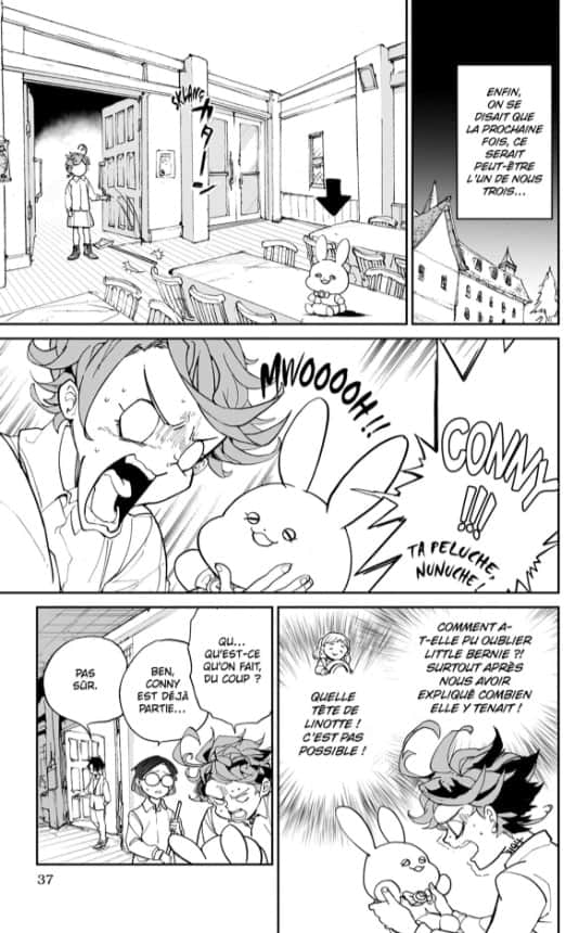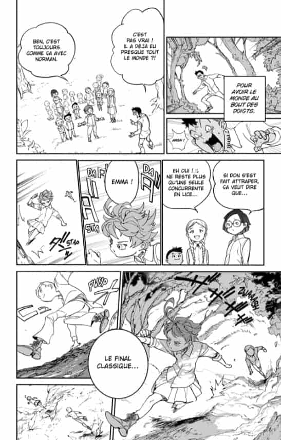 L’histoire de The Promised Neverland a un pitch de base qui tient sur un timbre poste. ” Des orphelins se demandent tout à coup pourquoi est-ce qu’il n’ont pas accès au monde extérieur et surtout pourquoi leur amis qui ont été adoptés ne donnent plus aucune nouvelle dès leur départ. ” Et voilà, rien qu’avec ça vous débutez une histoire accrocheuse. Surtout que dès les premières lignes on semble vous donner réponse à toutes les questions qui se posent au fur et à mesure.