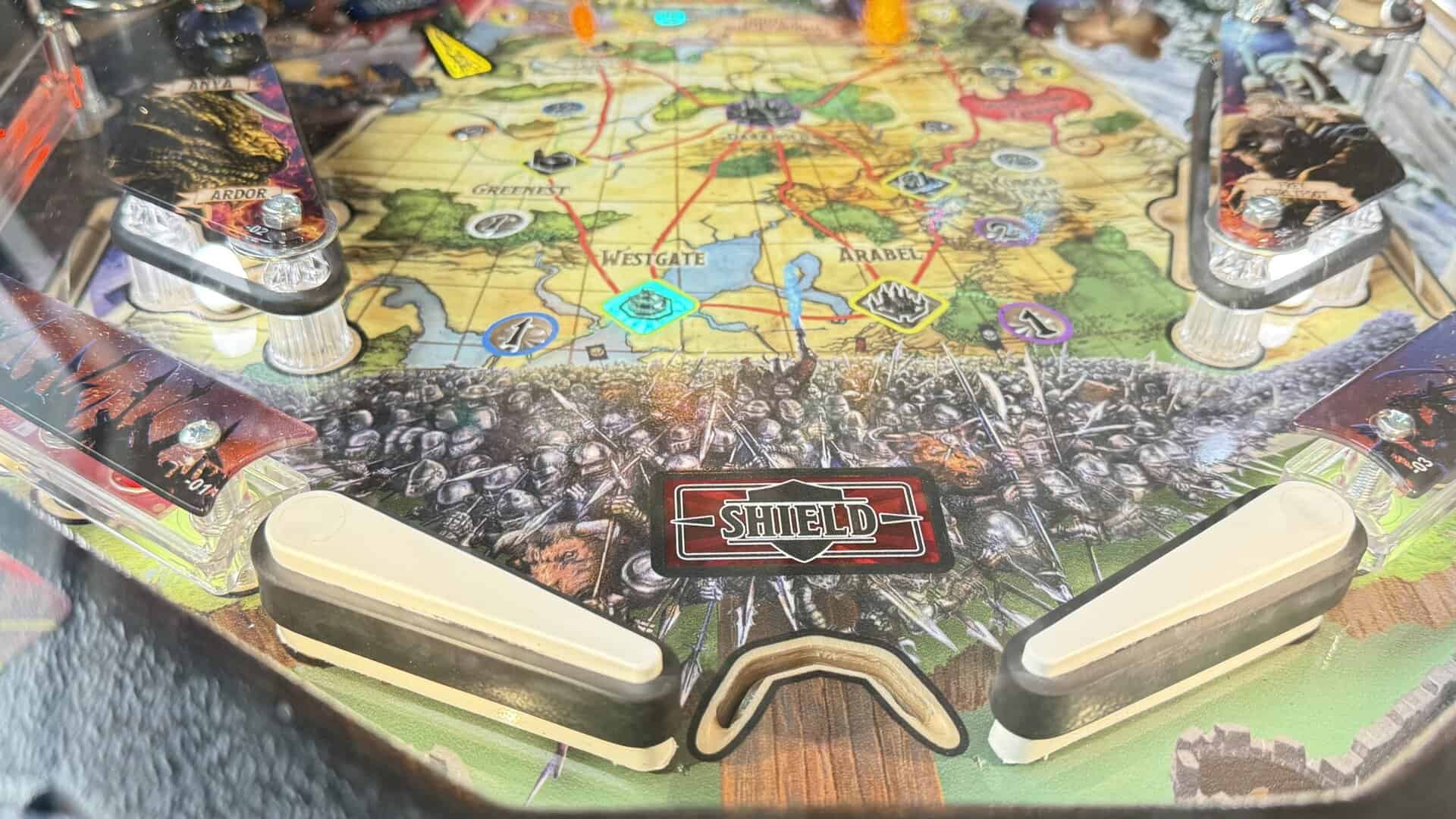 Le bouton central permet de déployer un bouclier entre vos deux flips principaux, pour empêcher de perdre une bille, mais également, en restant appuyé, de charger une flèche et de toucher des targets afin de vous aider dans vos combats.