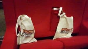 Direction la salle de projection. Tous les yeux sont attirés par l’affiche du film, projetée sur l’écran géant pour nous indiquer, au cas où, que l’on ne s’est pas trompé de salle (on ne sait jamais…). Et là, surprise, il y a des sacs déposés sur chaque siège. Pour ma plus grande joie, car j’adore les cadeaux ! Dans le sac, une planche de stickers du film et un sachet de bonbons. On ne va pas se voiler la face, c’est un bon coup de pub. Pour la projection de ce film deux youtubeurs étaient présents dans la salle et j’ai d’ailleurs pu prendre une photo avec eux.