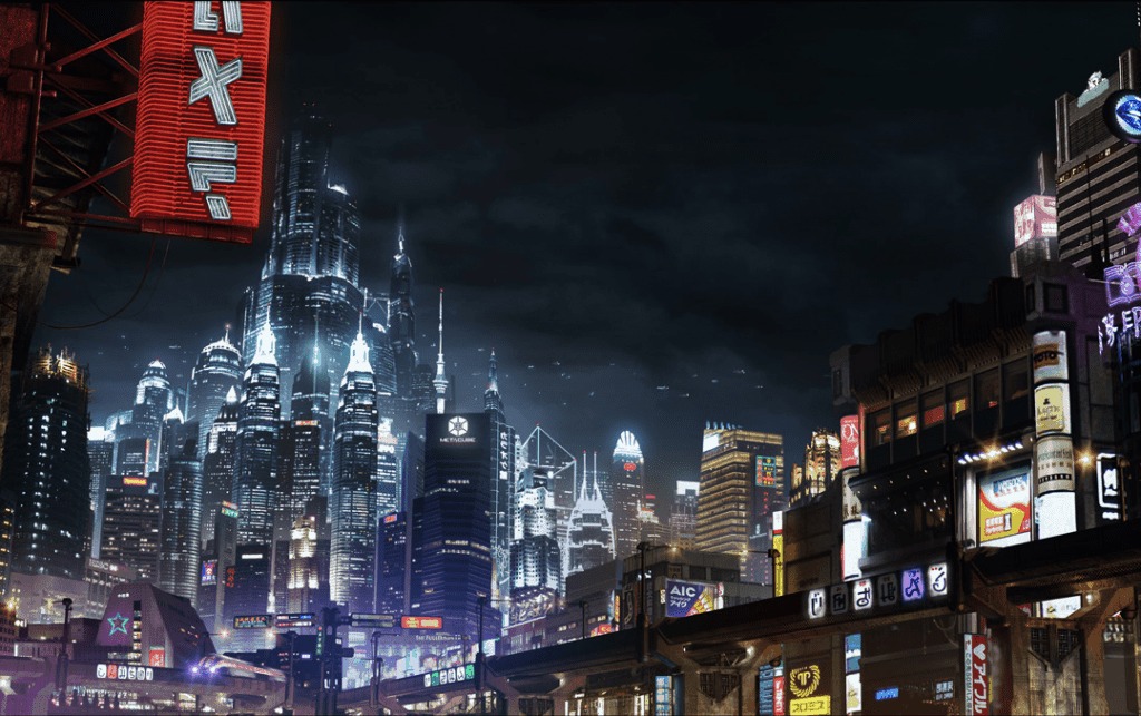 The Sprawl ne se propose pas de fixer un cadre dans lequel jouer, mais plutôt de donner les outils pour émuler une certaine esthétique : le cyberpunk. Ce genre noir met en scène un futur proche où les corporations dominent (presque) le monde, où la technologie est partout et où une poignée de hors-castes, des punks, se dressent comme ils peuvent contre le système en place. Or, dans The Sprawl, on joue des employés de l’ombre de ces mêmes corporations. Des gens remplaçables et jouant avec le feu : les corporations se retourneront contre eux tôt ou tard. Les joueurs sont donc invités à créer “leur” mégapole dans “leur” futur proche, en répondant ensemble à quelques questions et en laissant leur imagination divaguer et habiller ce qu’est pour eux “un futur cyberpunk”.