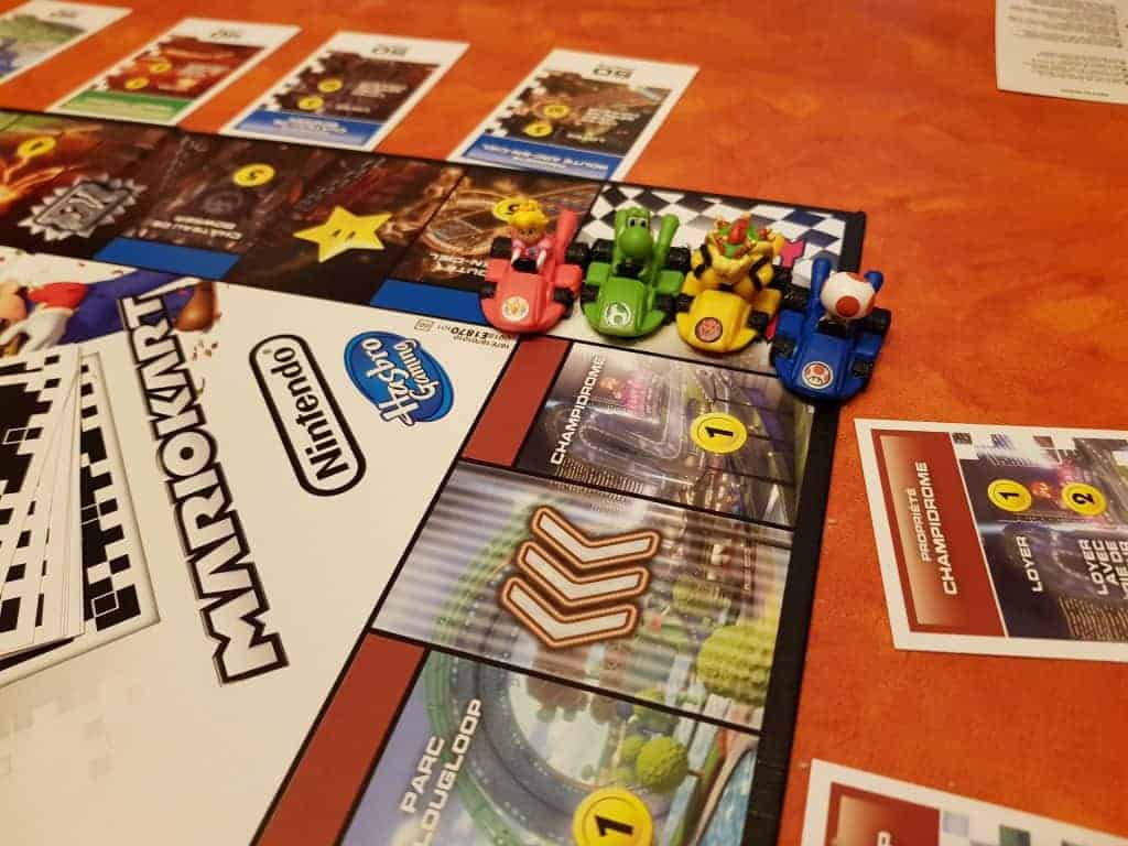 Enfin, dernière différence et non des moindres, ce sont les cartes course. Chaque fois qu’un personnage passe par la case départ il déclenche une Coupe Mario Kart. Chacun peut choisir d’y participer ou non (en payant un petit prix). Le vainqueur (en fonction du lancer de dé) remporte un bonus spécial tout comme le 2eme et le 3eme. Le jeu se termine lorsque la dernière course a été jouée. A ce moment-là, on compte les points de chacun en fonction du nombre de propriétés, de pièces et de cartes course remportées.