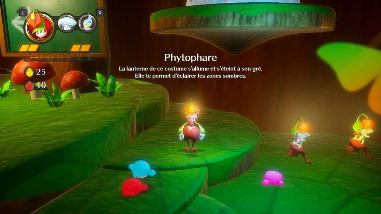 Au total plus de 80 costumes dont Noctillon vous transformant en papillon mais aussi Élastifleur, Phytophare, Bongourou, Doudragon, Méduzap… L’idée de base me plaisait vraiment car même s’il ne s’agit pas de se creuser les méninges, ces changements constants de costumes amènent une belle diversité de gameplay. Sachant que celui-ci s’articule autour d’un seul bouton, une chance que les costumes apportent autre chose.