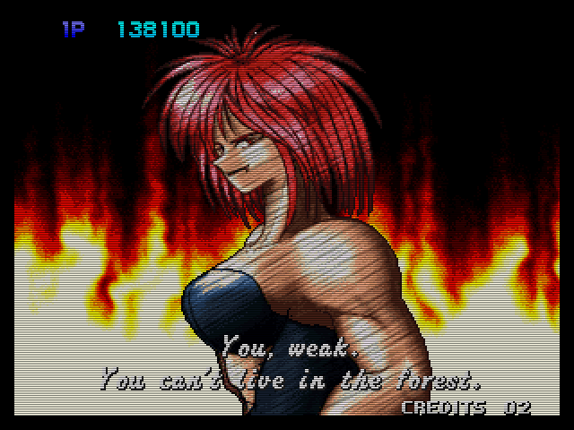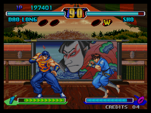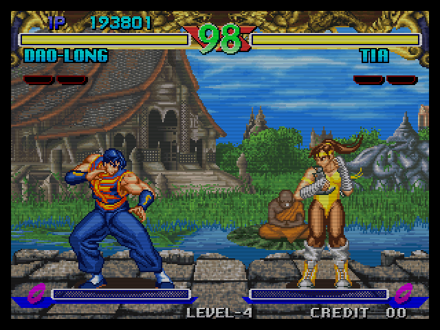 A coté de cela, les décors brillent par leur richesse, les personnages, bien que souvent calqués des belligérants des autres ténors du vs fighting de l’époque, parviennent à dépasser leurs égéries et dégagent une classe folle ! Le nombre des avatars est assez limité mais tient la route. Entre Sho (un Ryu upgradé), Alsion III (Le pharaon inspiré de Dhalsim), Dao Long (Le Bruce Lee-like façon Kim Dragon dans World Heroes), Tia (la babe mix entre Chun Li et Mai), … vous aurez l’embarras du choix. Les musiques sont bien pêchues, les bruitages classiques et la voix off légèrement nasillarde confèrent un côté très manga à l’expérience.