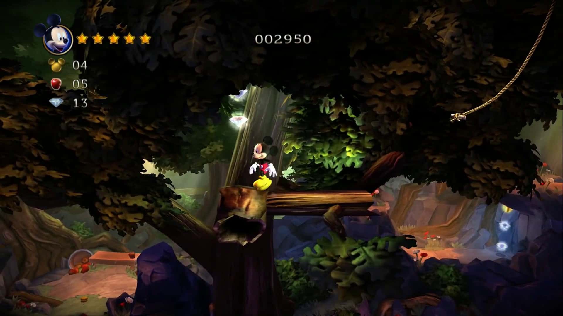 Les 5 différents mondes, aussi variés que colorés, reposent sur des mécanismes différents. Par exemple, dans le monde des jouets, Mickey a la possibilité de renverser l’écran et voir ses ennemis percuter le plafond. Dans la forêt du premier monde, Mickey devra se saisir de lianes pour se balancer au-dessus des précipices. Comme vous l’aurez compris, la maniabilité fait mouche, dotée de petites ingéniosités, sans pour autant trop bousculer le style.
